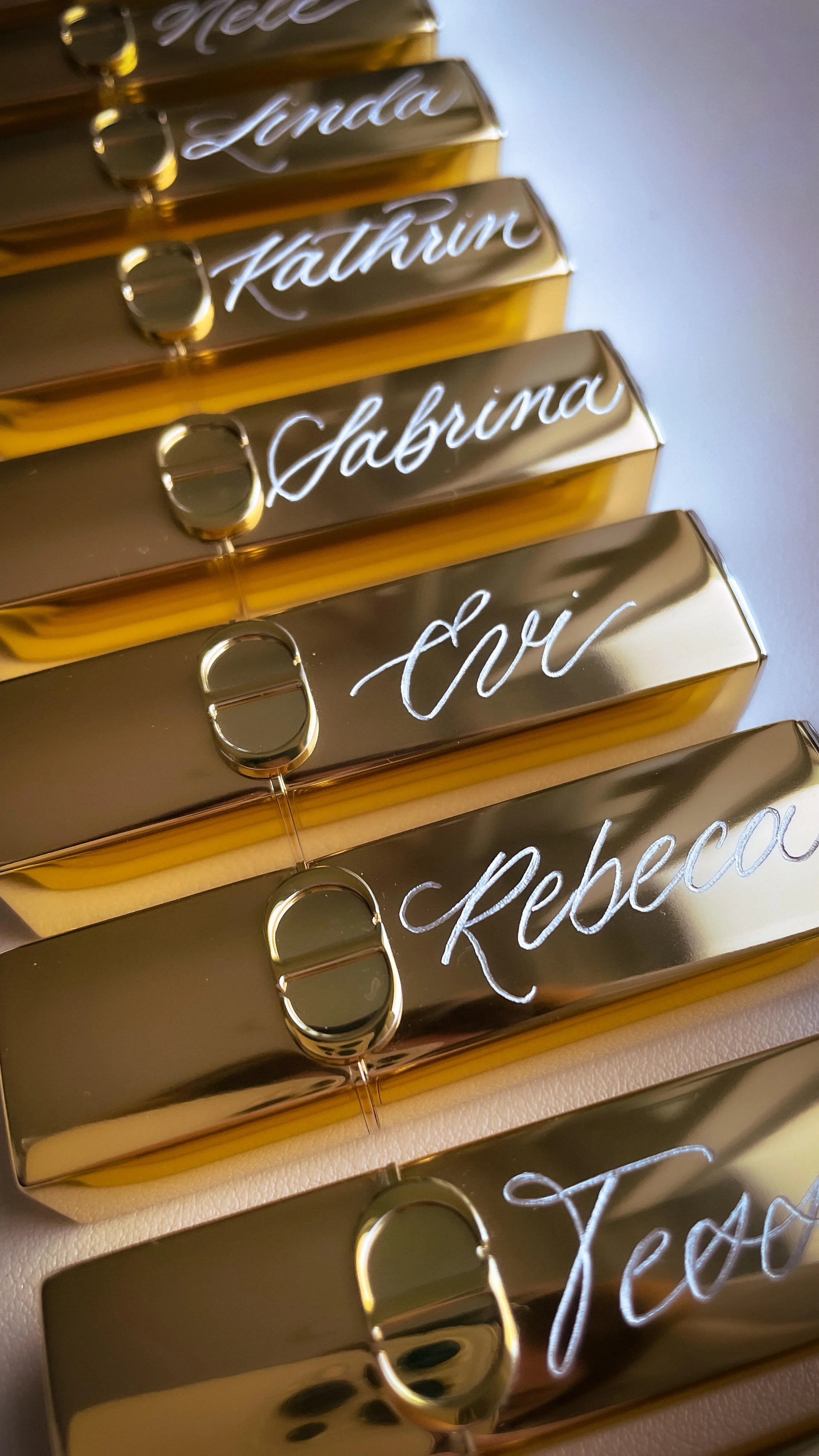 Vor Ort verwandle ich Produkte durch Kalligrafie, Gravur und Hot Foiling in einzigartige Erinnerungsstücke. Ob Store-Opening, exklusive Dinner oder VIP-Event – personalisierte Kunstwerke schaffen besondere Erlebnisse für Gäste und Kunden.